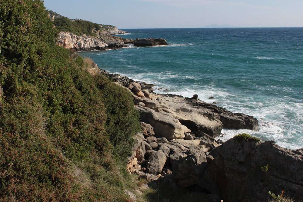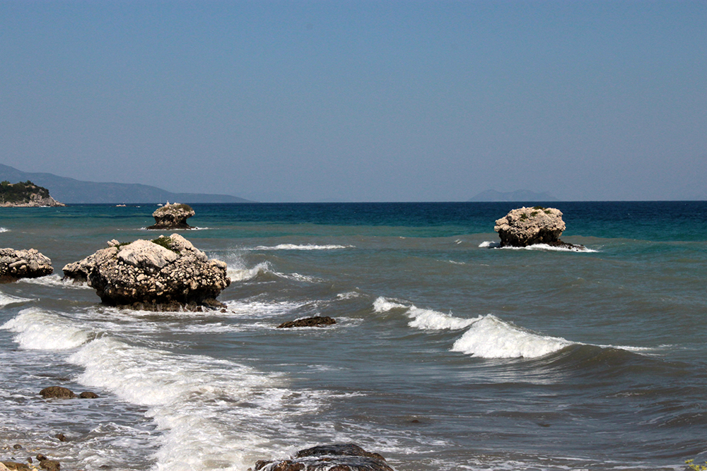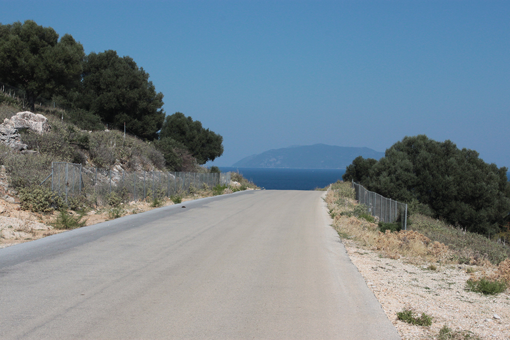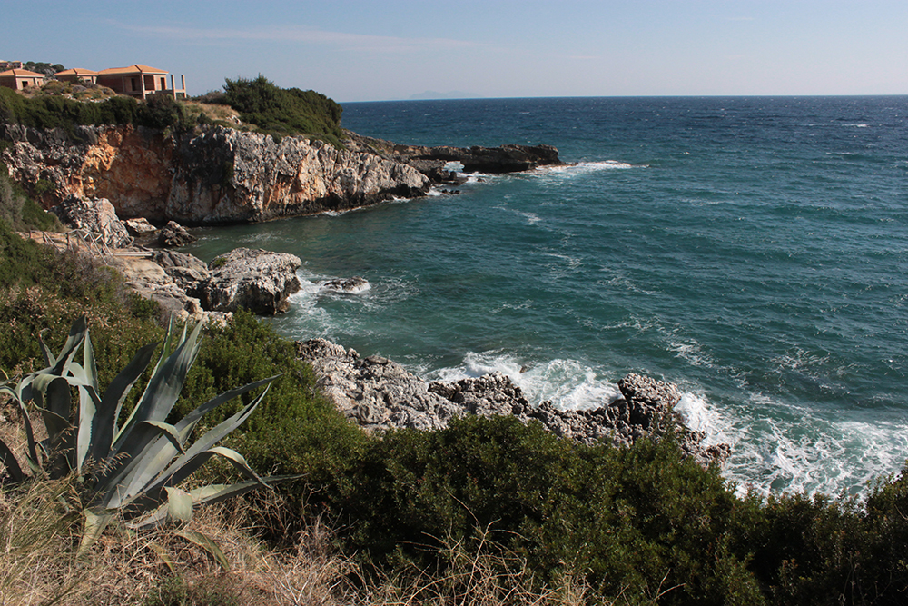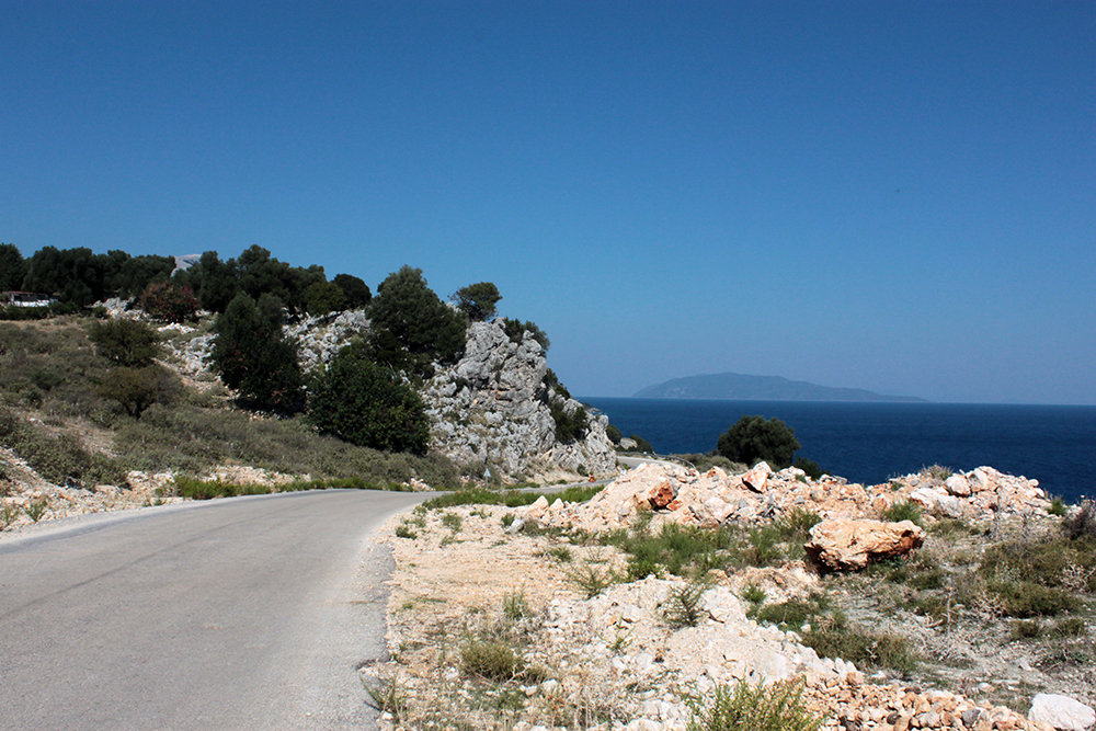 So the first real excursion I took was on foot, to Poros along the unnamed coastal road. The sign in Skala said it was 12km (about 8 miles) so I figured I could easily walk there in the morning, have a nice lunch and take a taxi back before starting work since there is not a lot of public transportation here.  Walking along Skala beach, I passed some of the big hotels, but it still doesn’t seem overdeveloped. The buildings are pretty low and they are set back from the beach road, sometimes fronted by tavernas, or gas stations or supermarkets.  It might be entirely different in July and August, but now it was very quiet and really lovely.