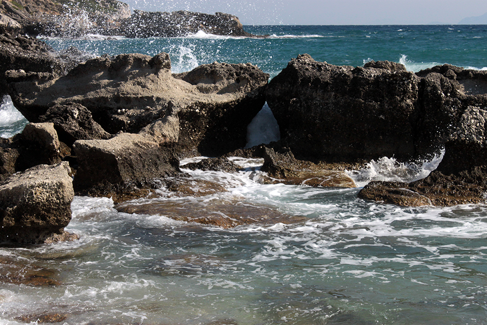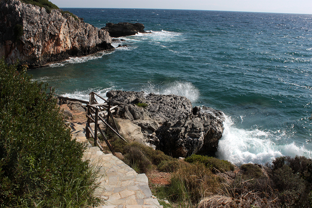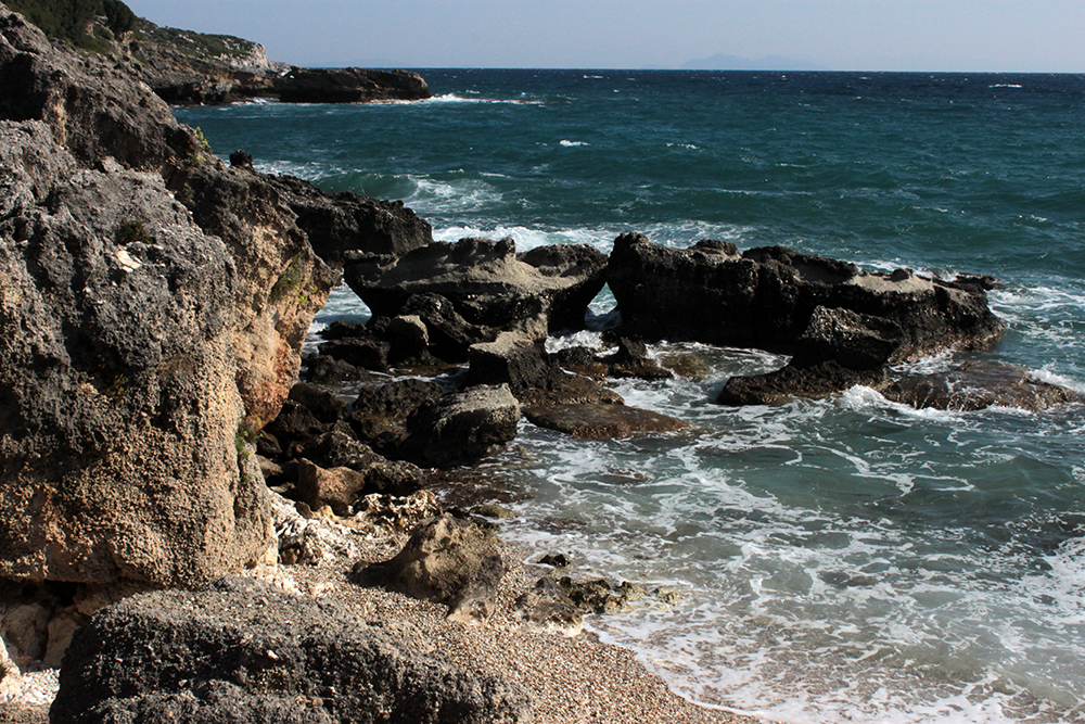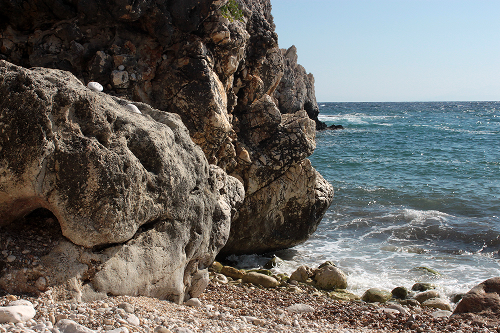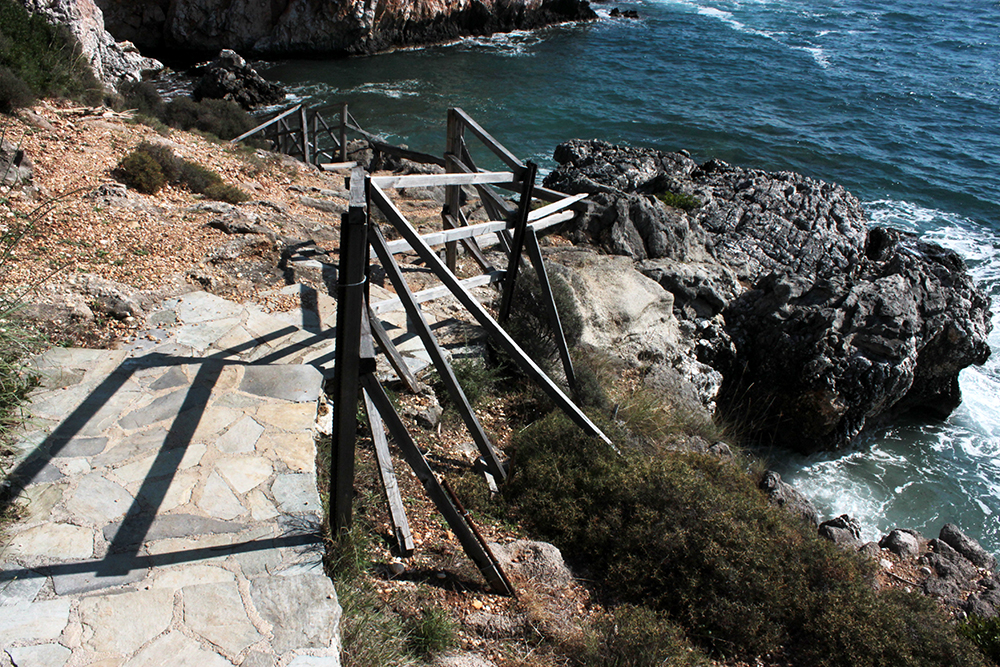 Next, was to just enjoy the scenic hike along the coast, photograph some of the enchanting landscape, swim at some hidden beaches and have a nice lunch by the sea in Poros.  This was one of favorite days here.  What an amazing coastal road!  Outside of Skala and past the temple, it seems like every 10 minutes there is a path down to another secluded beach and as you get closer to Poros the landscape changes and the road winds through barren hills with spectacular views of Mount Atros.  I could have spent all day going from beach to beach but just went to two for quick swims and photos since I had to be back in Skala by 3.