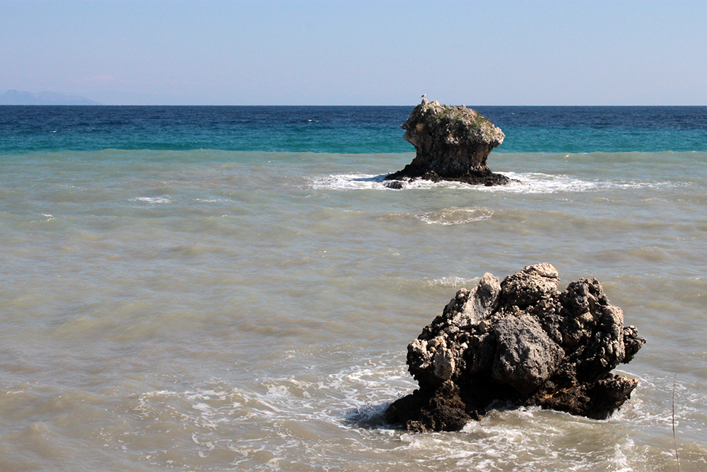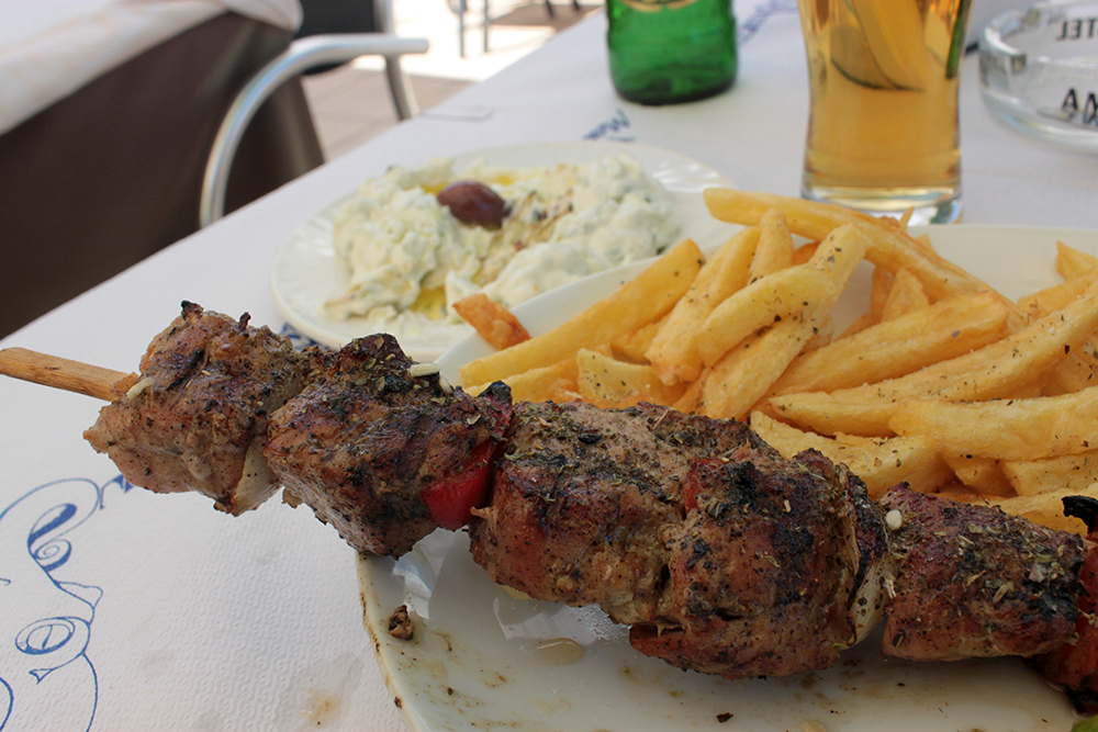 Hungry and thirsty and hot, I just went to the first taverna I saw on the paralia, Totolinos, I think.  Couldn’t wait for an ice cold Mythos, some souvlaki and tzatziki and just sat down, apparently in the wrong taverna.  In about 10 minutes, a very nice woman from the wrong taverna brought me over to the one I intended to go to.  Her name was Vicky and she started chatting to me in her very limited English and I chatted back in my even more limited Greek.  Mine consists of pointing to myself and blurting out my name or the name of the town where my grandfather is from or random words or sentences I know.  I wanted to translate something from English to Greek so I asked her, but she looked at me with the same face I have when someone speaks to me in Spanish too rapidly.  But our obvious lack of a common language did not stop her from sitting down and talking. We exchanged names and I told her I lived in New York and that I was part Greek and that part is from the Mani, a peninsula in the Peloponnese where I’ve been told inhabitants are infamous for their strong, unyielding disposition and vendettas.  It’s beautiful, I visited my grandfather’s town with my sister years ago and the whole region is stunning.  So she was also from the Mani, some place that started with a K (I should have wrote it down) and then she started talking about her yaya and I told her my yaya wasn’t Greek but my pappous was, and then she got up and pinched my cheeks and took my hand and wrapped her hand around it and said “Maniates” and then pointed at me and then pointed at herself and then tapped her own eye a few times.  Maybe I shouldn’t have told her my grandfather’s last name.