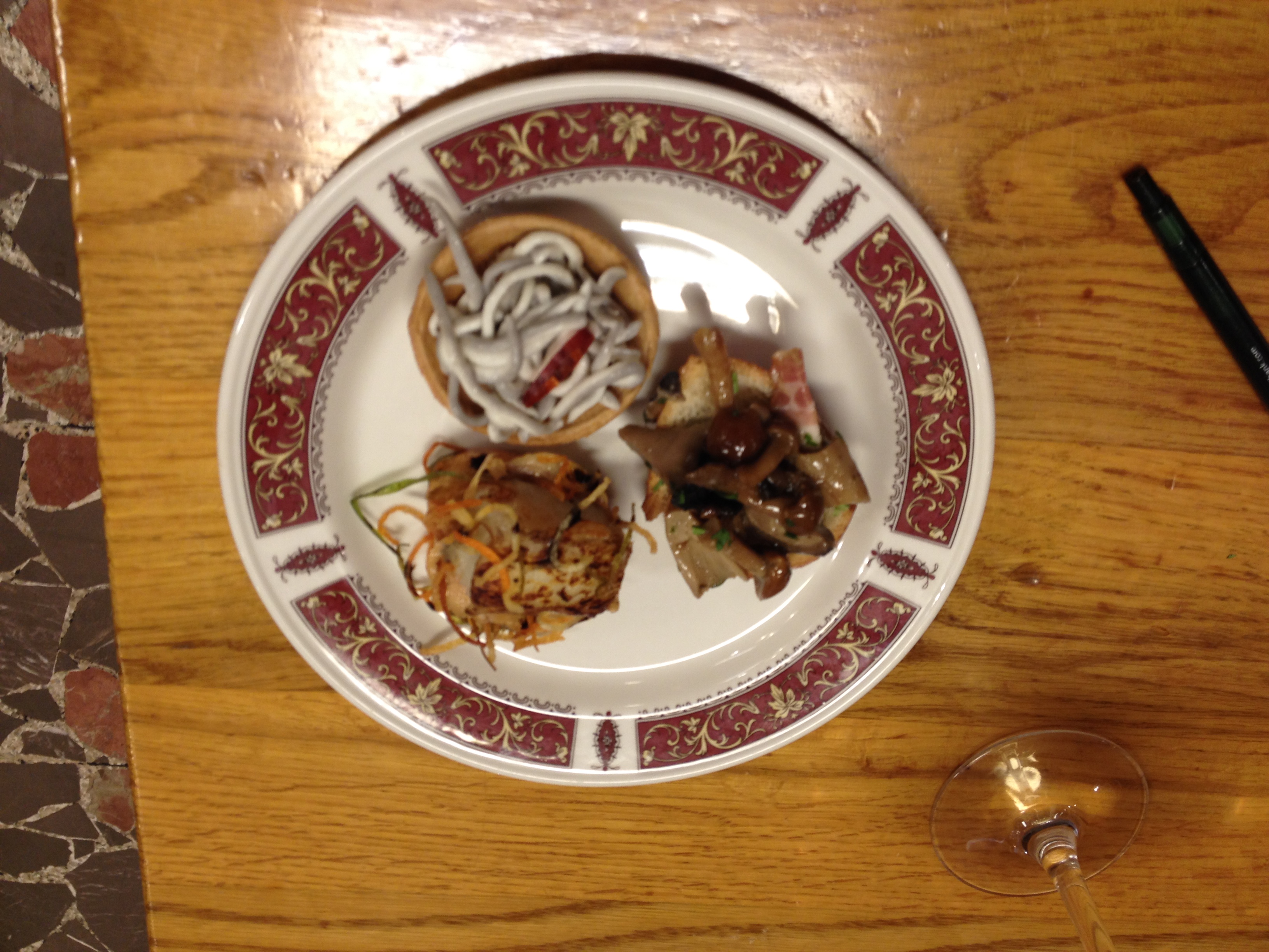 My three pintxos. Top: baby eel tart, right: wild mushroom thing and left: cod with crispy vegetables