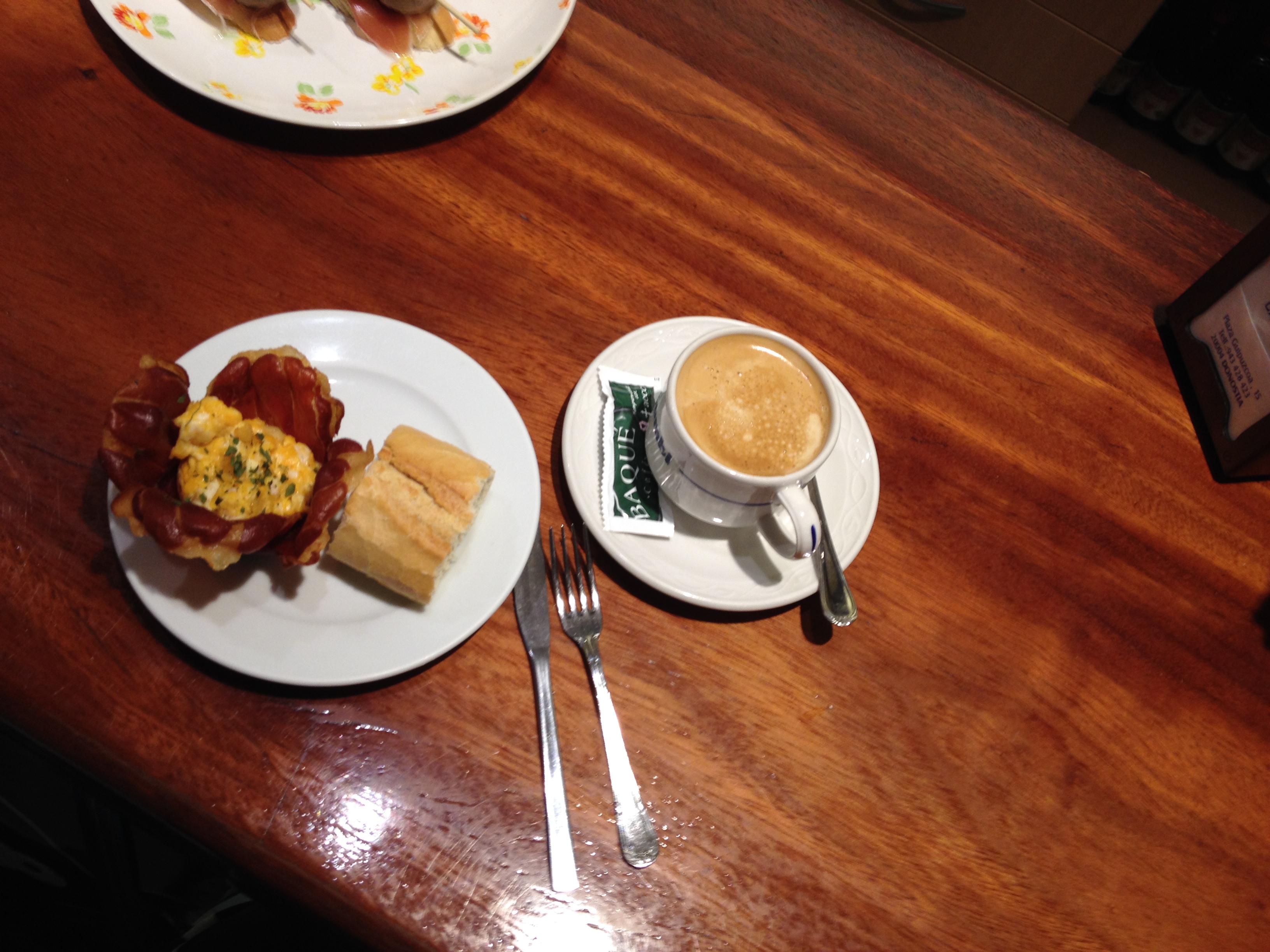 But the best thing I ate so far was the serrano ham flower with egg and cheese and garlic I had yesterday. I can’t remember the name of the place, it started with an I, and the napkin is downstairs and if I get up I’ll probably bump my head on the ceiling or fall down the ladder so I’ll just update this tomorrow. Coffee was slammin’ too. I might go back there tomorrow if I can find it again.