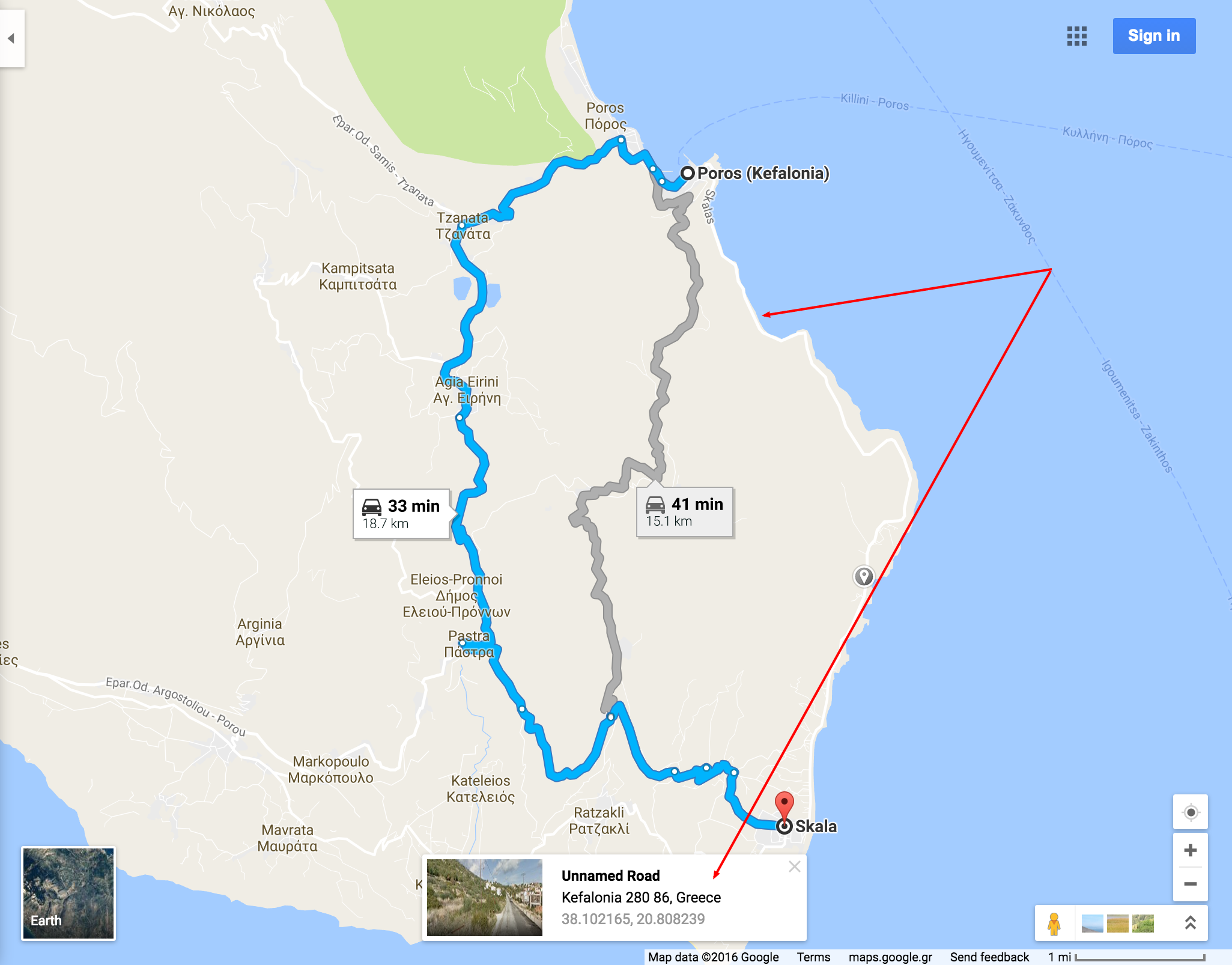 I’m not sure about that interior road, although I might walk it next week when I go back to Poros, we drove along the “Unnamed Road” to get to Skala. Approx. 12km.