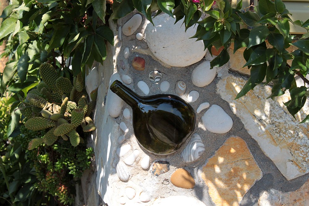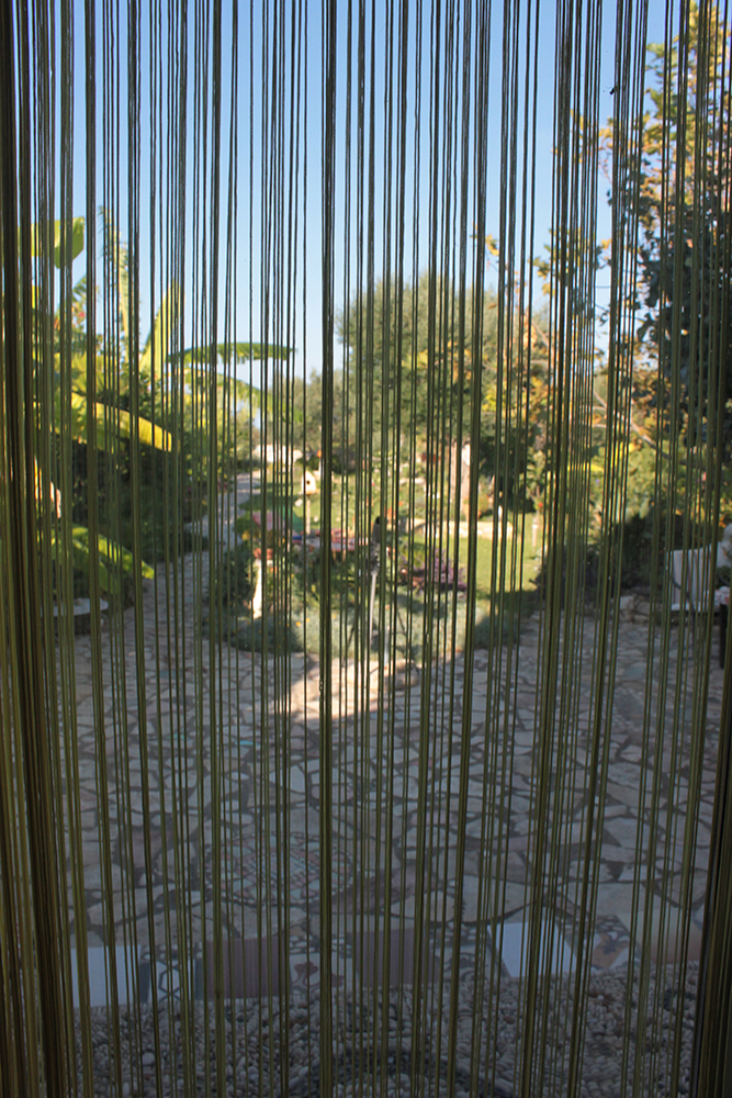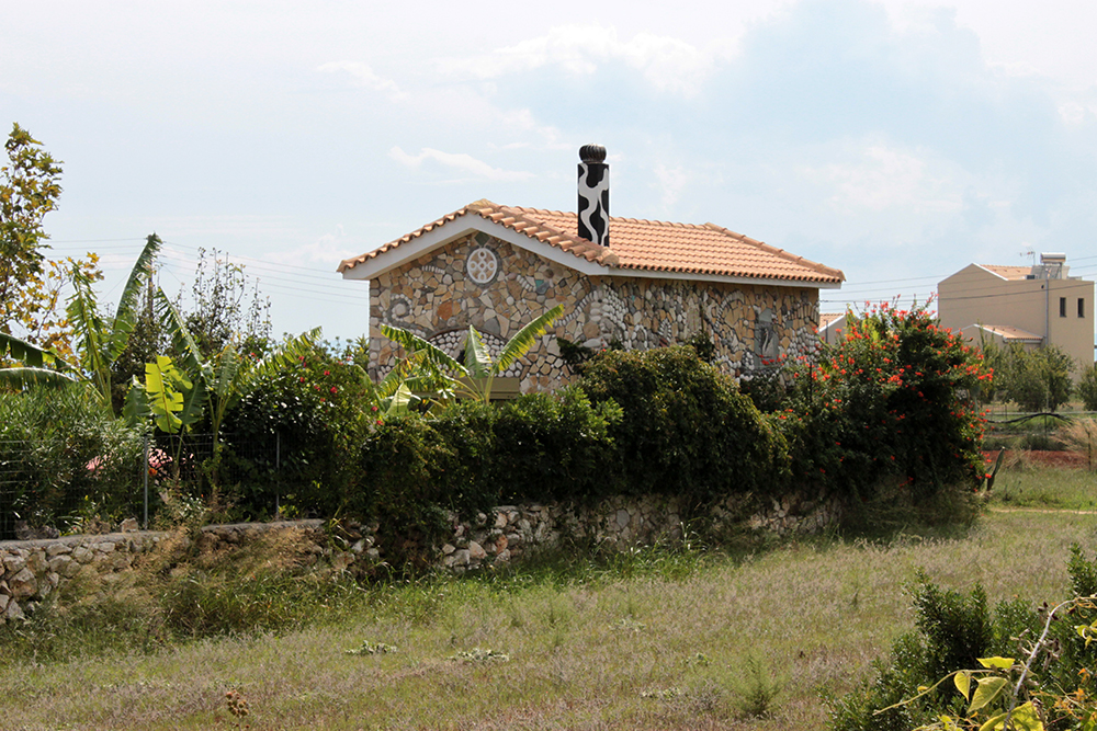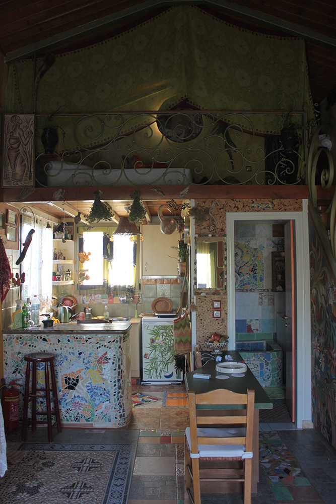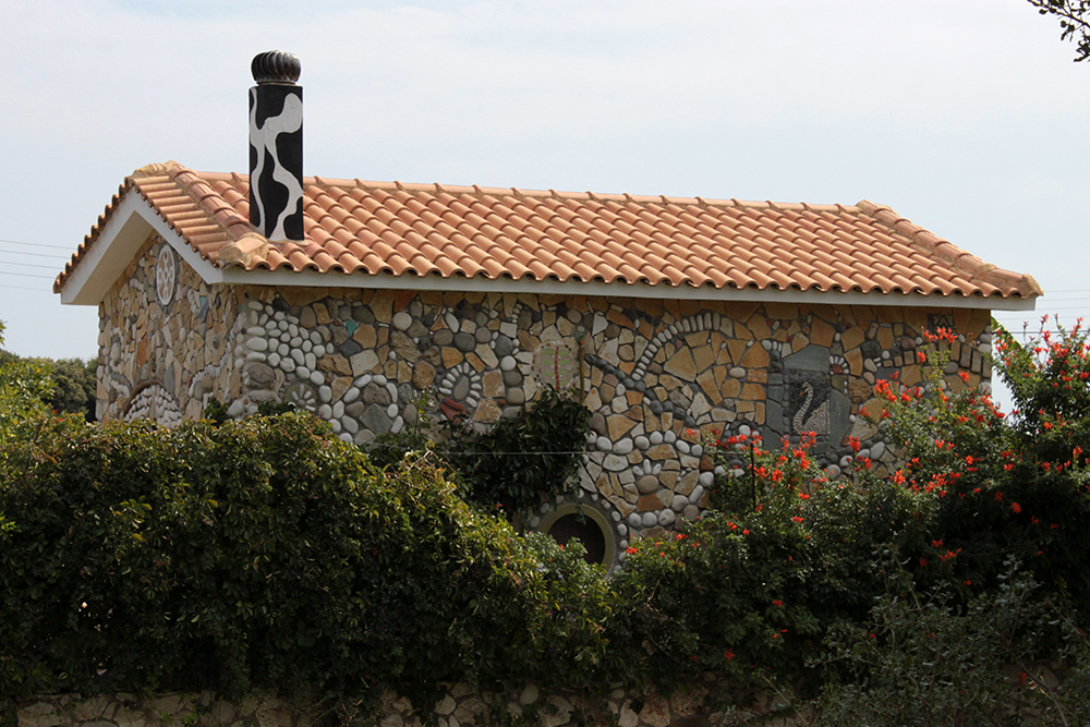 The house.  What can I say, it is just spectacular. So unique, and I love every creative inch of this little gingerbread home made of sea pebbles and stone and tiles and colored glass and shells and cork and metal and wood and mosaics and just surprising details at every turn.  On one corner of the outside facade, there is a Tsantali wine bottle floating on a wall of pebbles. I have three of those bottles in my apartment on a floating ledge on my kitchen wall!   And there are spirals everywhere (I love spirals!) from the railing on the staircase up to the loft bedroom to the insets on the fireplace.  Yes! There’s a fireplace. And a cow print painted chimney!  Every day I notice something new. Like right now I am looking at this thing that’s suspended from the slanted wood ceiling over the fireplace that looks like an elongated corn cob still in its husk.  A straw hat lamp shade is peeking at me too. I’ve been here almost a full week and I’m still noticing new things. And I am still in absolute awe of the place.